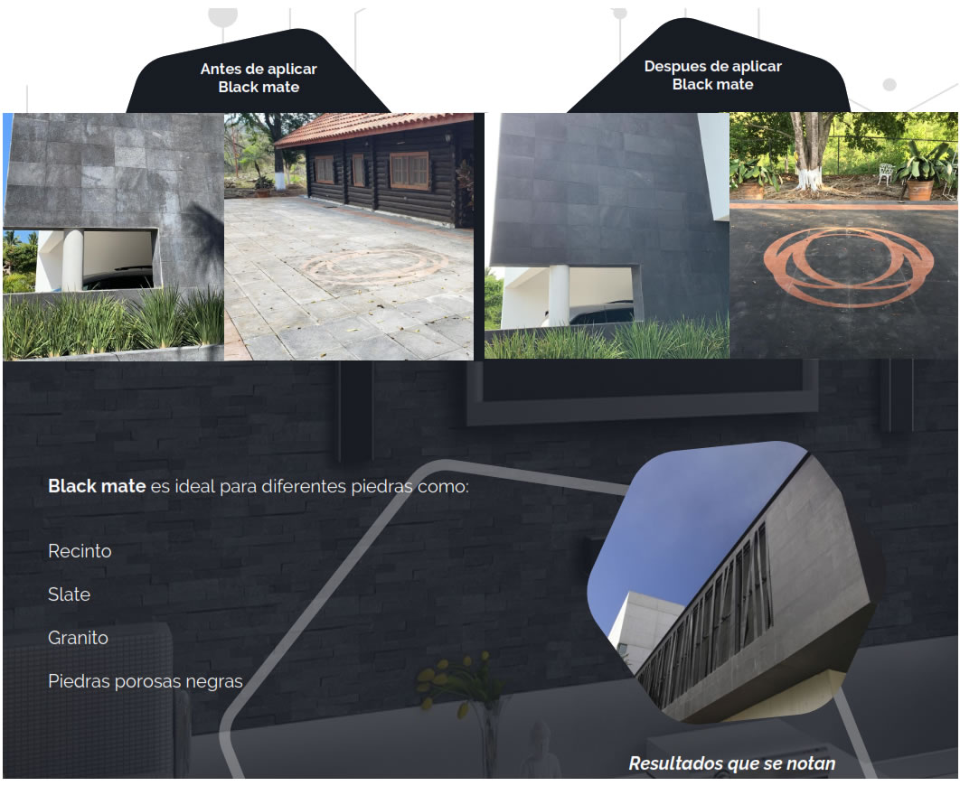 Intensifica el tono negro de las piedras, agregando un tono intenso mate. Protege contra las manchas y la abrasión.