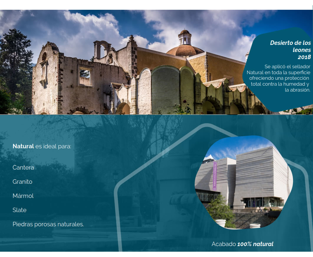 Productos para el mantenimiento y la limpieza total de sus piedras naturales sin afectar el brillo y el tono natural. Natural es un producto para proteger y sellar las piedras naturales sin cambiar su apariencia. Tiene cualidades hidrofugantes que lo hacen ideal para zonas sumergidas o en constante contacto con agua. Se puede aplicar en concreto. Protege contra las manchas y la abrasión. No modifica el tono de la piedra. Protege contra los rayos UV y la decoloración provocada por el sol. Facilita la limpieza y el mantenimiento de las piedras.